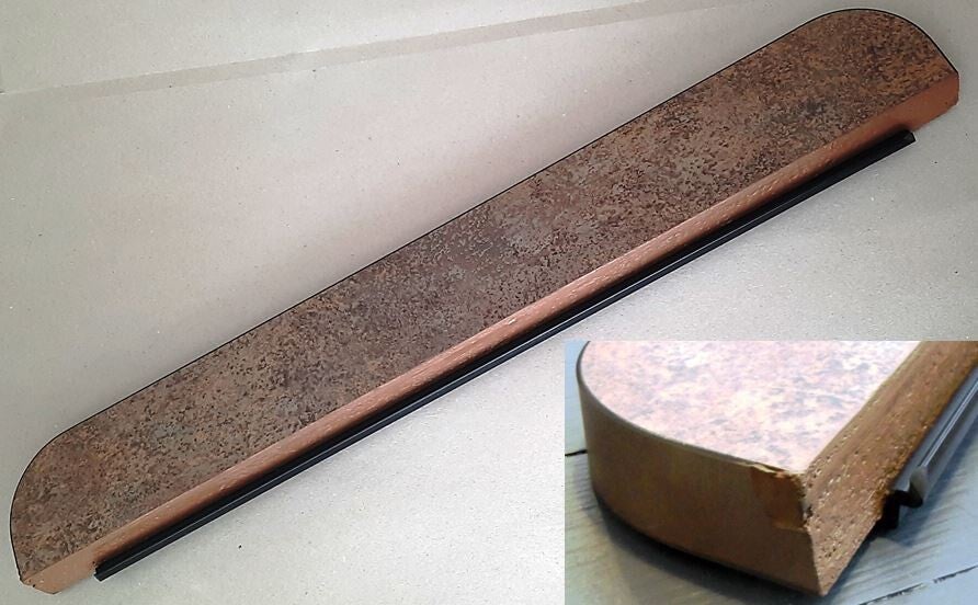 Zagen met een fijn getande zaag want het blad bestaat uit gefineerd piepschuim. Daarna kitten we het piepschuim bruin en monteren de plastic strip van het nachtkastje (foto rechts).