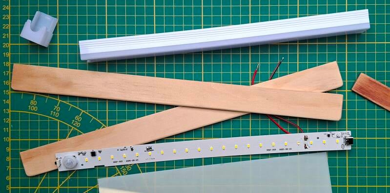 Lamp ingelijmd tussen houten latjes en toegevoegd een kleine buck converter om de voeding aan te passen aan 12V=.