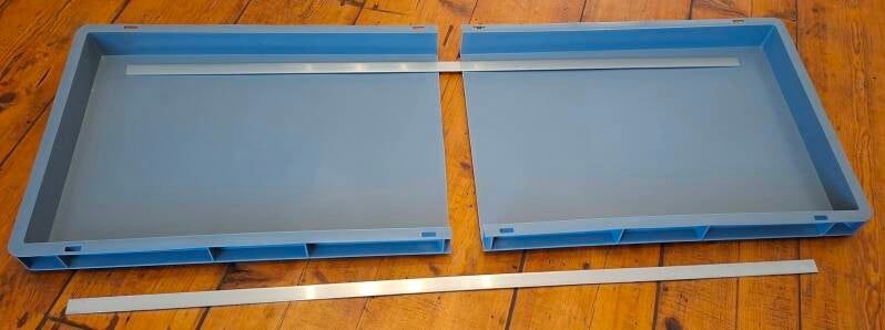 We nemen twee euro stapelbakken van 600 x 400 x 50 mm en zagen deze in de breedte zo door dat de lengte samen 111 cm wordt. Verstevigingen bestaan uit aluminium strips en een U-profiel. Tentstokken worden met klittenband 'dividers' gefixeerd.
